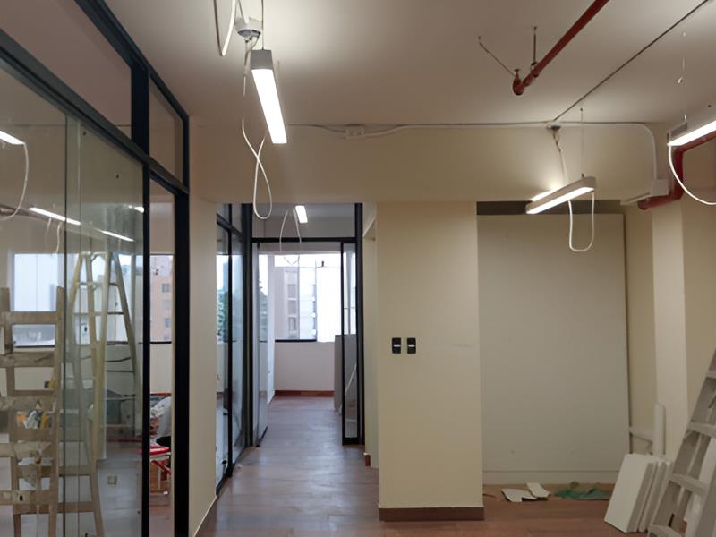El proyecto consistió en la implementación de coworking y oficinas, cumpliendo con la ejecución de revestimiento de piso, implementación de mamparas de vidrio, muros en drywall, separadores de madera, instalaciones eléctricas con tuberías conduit, luminarias led, mobiliario para oficina, vinil en muros/vidrio y acabados en pintura.